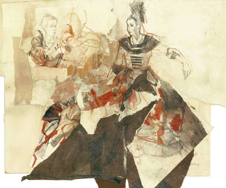 Graphite pencils, crayons, pastel colors, gouache, watercolors, golden pigments on paper with collage October 2010 19,3" x 20,9" (49 x 53 cm) Signed and dated on the front Your will receive a Certificate of Authenticity. Please note: the hem of the dress goes over the edge of the paper.
