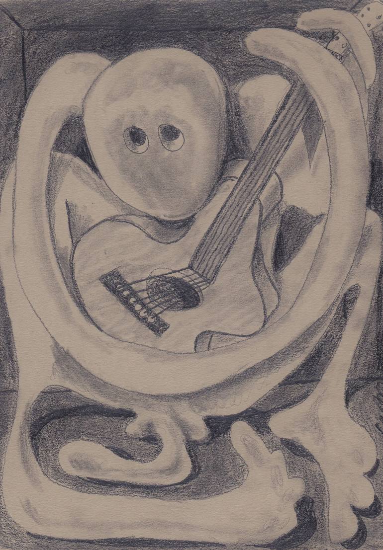Classic Picasso inspired theme of man with guitar. Figure of a caged man playing on a broken guitar. Pencil on aged paper.
