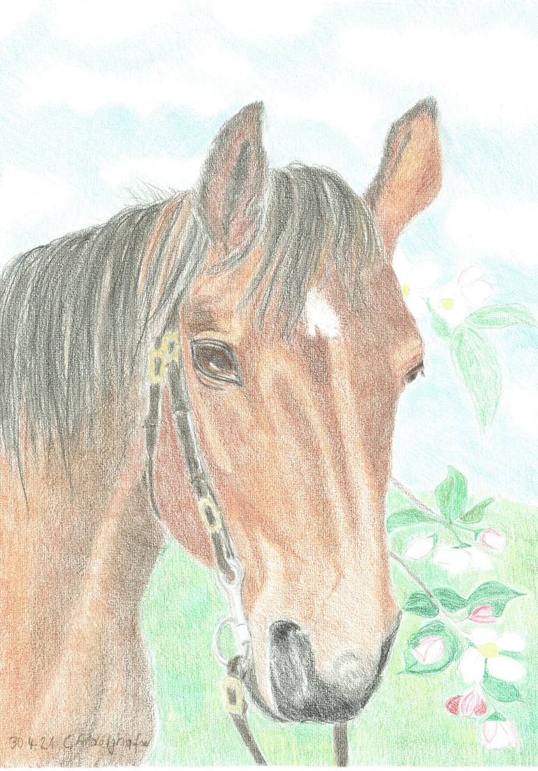 This delicate coloured pencil drawing presents the portrait of a graceful horse in an idyllic setting. The beauty and dignity of the animal has been captured with fine, precise strokes. Its head is worked out in detail, with particular attention paid to the expressive eye, the pointed ears and the g...