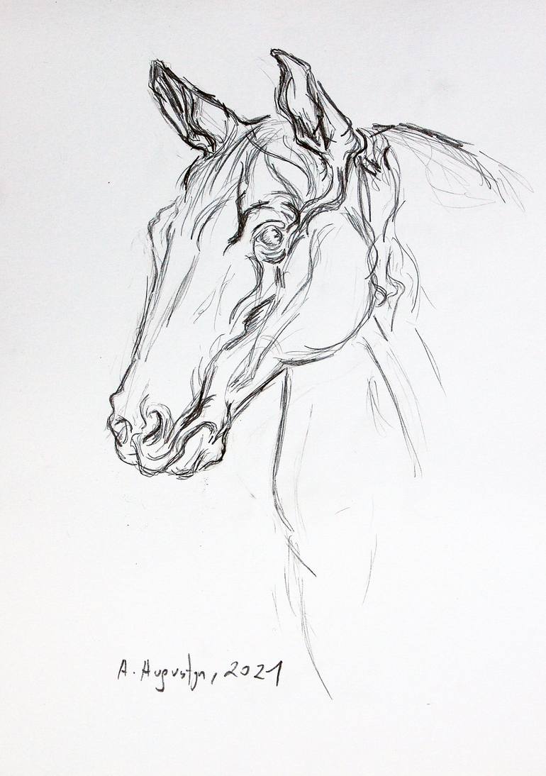 Pencil drawing on paper. Signed and dated on the front. Framed (clip frame). The drawing focuses on contours and shapes, and the absence of shading adds a unique aesthetic character to it. The horse's head is depicted in simple yet precise lines. The artist captures the contours of the muzzle, expre...