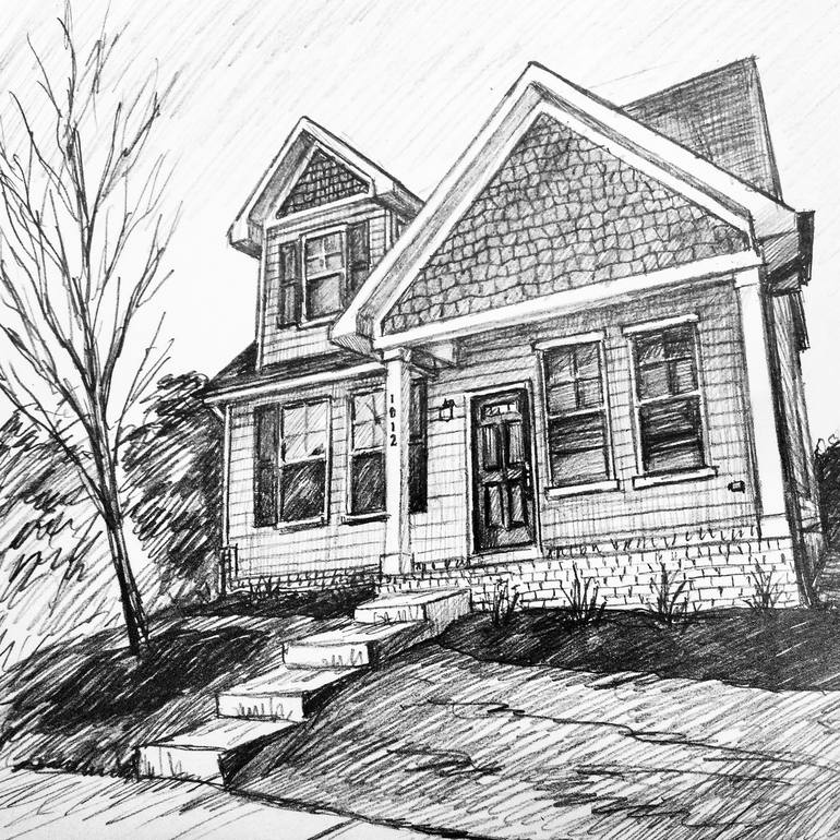 House Sketch Pencil Drawing in Black and White 24x24 inche