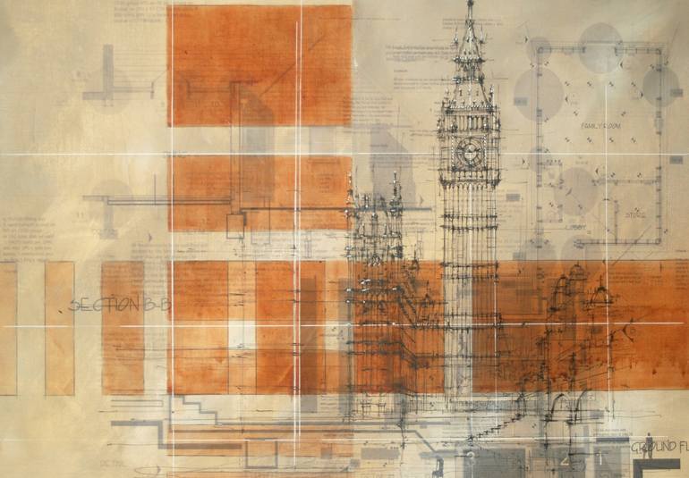 Ink drawing of the Houses of Parliament set against technical drawings.