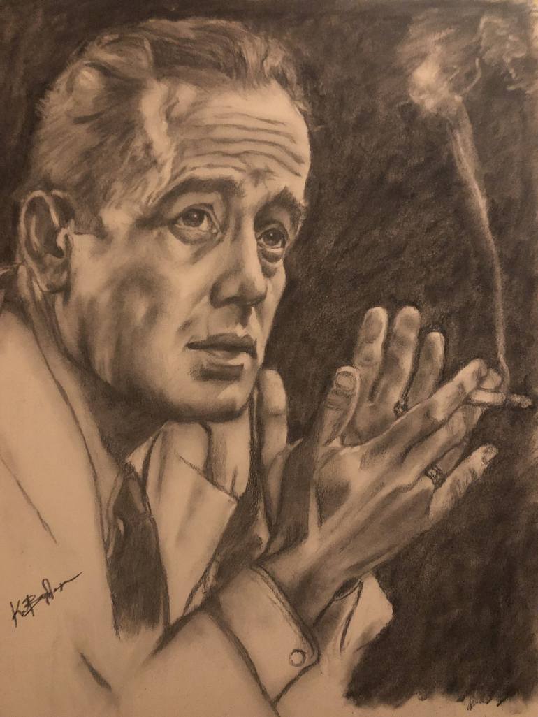 This striking drawing captures the enigmatic allure of Humphrey Bogart in a moment of quiet intensity. Rendered with charcoal and conte on toned paper, the artist masterfully recreates the dark, atmospheric mood of classic film noir photography. The interplay of light and shadow brings Bogart's icon...