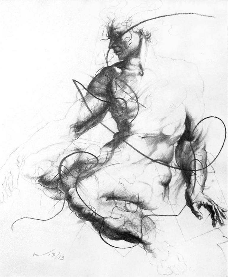 Similar to the way a Jazz performer uses a familiar song as a starting point for improvisation, artist Richard Claraval uses the human figure as inspiration for creating Abstract Expressionist gesture in his charcoal drawings and adding abstract forms to his polystyrene sculptures. These extend the figure physically, emotionally and philosophically. Sometimes these gestures and shapes eurhythmically echo the figure, a la the draperies and landscapes of Renaissance and Romantic art, and sometimes they make visible the beautiful lines inscribed in space by dancers and athletes. Being enamored of both the Renaissance human figure and Abstract Expressionism, Claraval seeks a fusion of the two. Both are deeply involved with the kinesthetic sense. Just as one “feels into” the of a figure moving through space, the sense that one is moving with the arcs and slashes of Abstract Expressionism is clear. Having a strongly romantic bent, Claraval’s work is often passionate and intense, and Classical music is a main reason for this and one of his biggest inspirations. https://. ----------------- Claraval's honors include a juror’s award at the Associated Artists of Pittsburgh’s Annual Exhibition at the Carnegie Museum of Art and a juror’s award at a group exhibition at Panza Gallery. His drawings and sculptures have been in solo and group exhibitions in galleries and museums throughout the Eastern U.S., including The Bascom Center for the Visual Arts, in North Carolina, the Carnegie Museum of Art, the Pittsburgh Center for the Arts, Westmoreland Museum of Art and Gallery NK in Washington, D.C. His male nudes have been featured in The Art of Man Magazine. Mr. Claraval’s work is in collections throughout the east, including Westinghouse Corporation, collection of Dr. Ted Steliotes and the Friends of Art Pittsburgh. Born in 1952, Claraval grew up in a small western Pennsylvanian town, and now resides in Pittsburgh. He received a B.A. in art from Indiana University of Pennsylvania in 1977. ---------------- Some notes on my process: Drawings: I sometimes start with a general, cloud-like image of the entire piece in my mind – and then gradually bring it into focus, adding in the figure and other elements at the same time. In this case I create a pose for the figure that fits my overall vision.