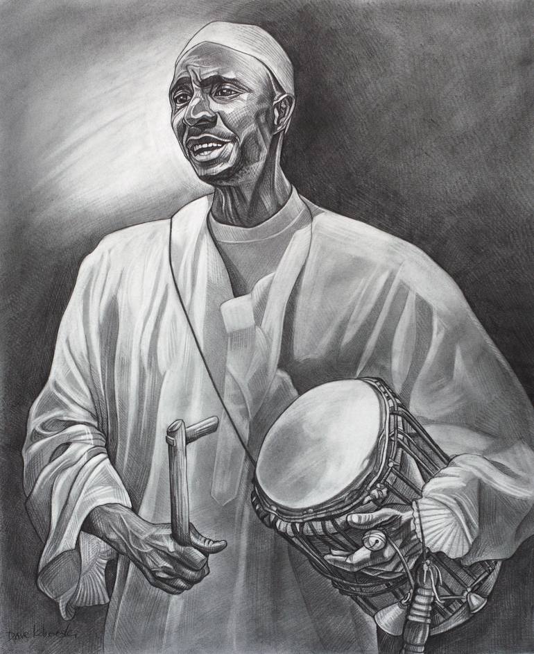 A pencil portrait drawing of an African Muslim man singing and playing a traditional drum in a village in West Africa. In the village, there was a huge celebration one day honoring the chief 40 days after his death, as was the custom. The festival was interesting to me on many levels, not the leas...