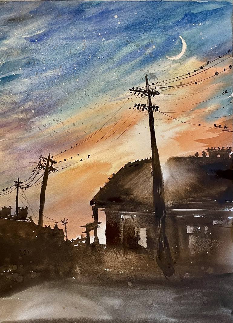 This watercolor painting is a testament to the loose and expressive technique of the artist, capturing the essence of a rural street in Jamaica during a mesmerizing orange and blue sunset. In this artwork, a quaint house and a solitary post take center stage, appearing as silhouettes against the bac...