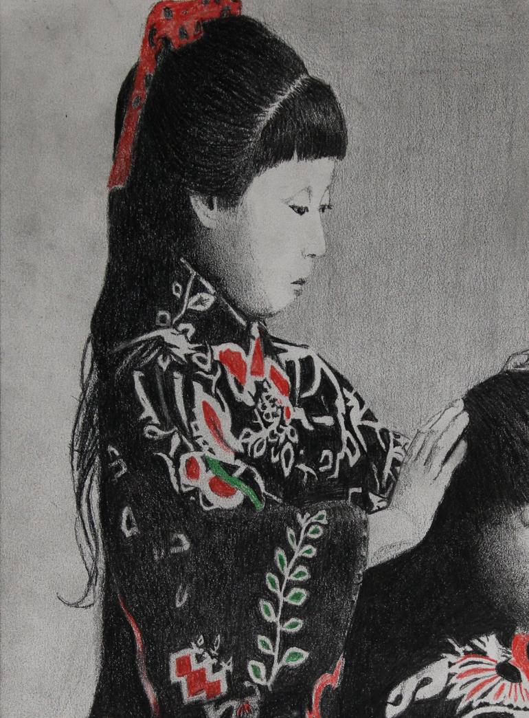 This 9"W x 12"H color pencil drawing was drawn from a vintage black and white reference photograph with selected colors manually added. The standing girl appears to be intensely focused on the task at hand while the seated girl gazes casually at the viewer. This will make a very unique conversatio...