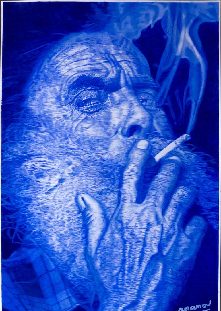 Dessin au stylo bille Bic d'un vieux monsieur . le dessin est à moitié effectué avec un effet flou.