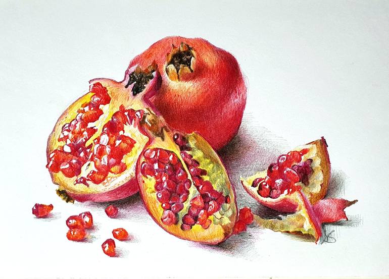 This work is a realistic representation of a pomegranate, executed with amazing precision and attention to detail. The painting focuses on the fluidity and richness of textures - from the smooth surface of a whole pomegranate to the complex st ructure of its interior, filled with juicy grains. The...