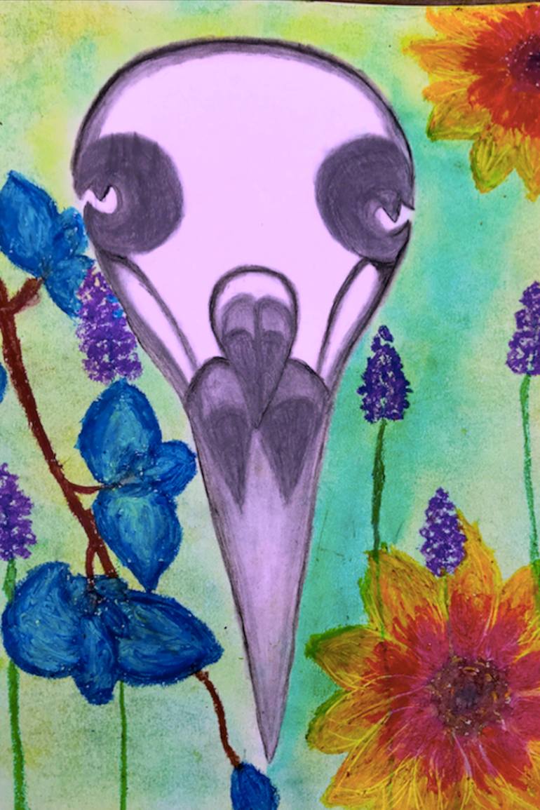 A Raven skull sits among flowers in a field of green, as a comparison and contrast between the world of the dead and that of the living. Each flower has it's own symbolism, blue orchids for love, luxury, beauty and strength. Sunflowers for adoration, loyalty, and longevity. Lavender for refinement, ...