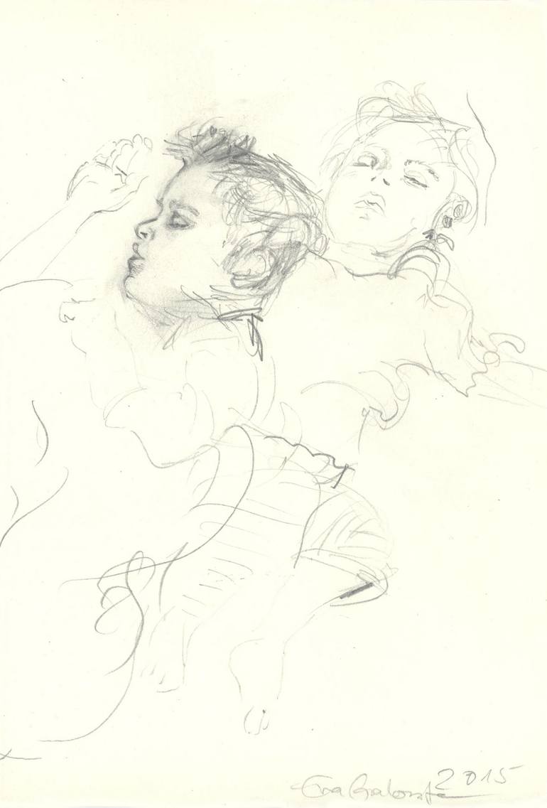 My children fell asleep together in my bed. At last a chace to draw! Draw them, the beloved ones. Is it a scetch? Is it a finished piece? It is just the desire to catch my own love.