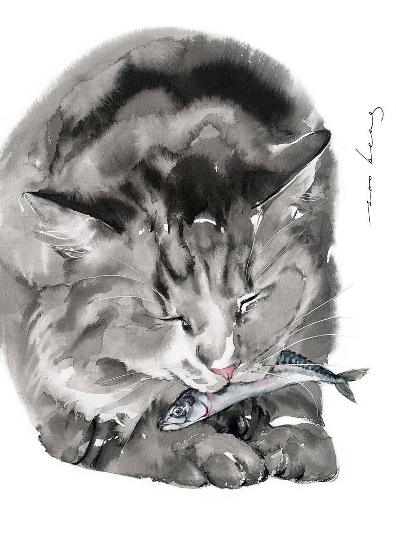 Cat relishes the sampling of his fish dinner in a quiet corner. Ink and watercolour on Saunders Waterford 300gsm smooth cotton paper.