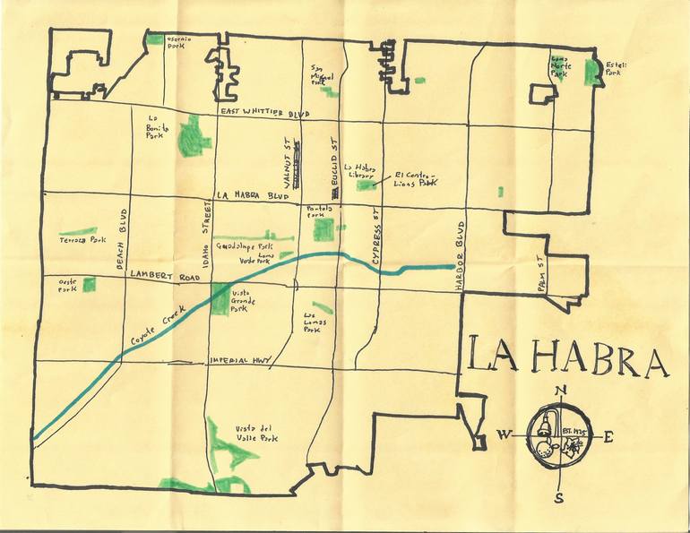 In 2019, I visited and explored the city of La Habra in North Orange County for my series, "California Fool's Gold." It was a rainy Monday and it seemed, therefore, like most things were closed. The exploration and map are included here:
