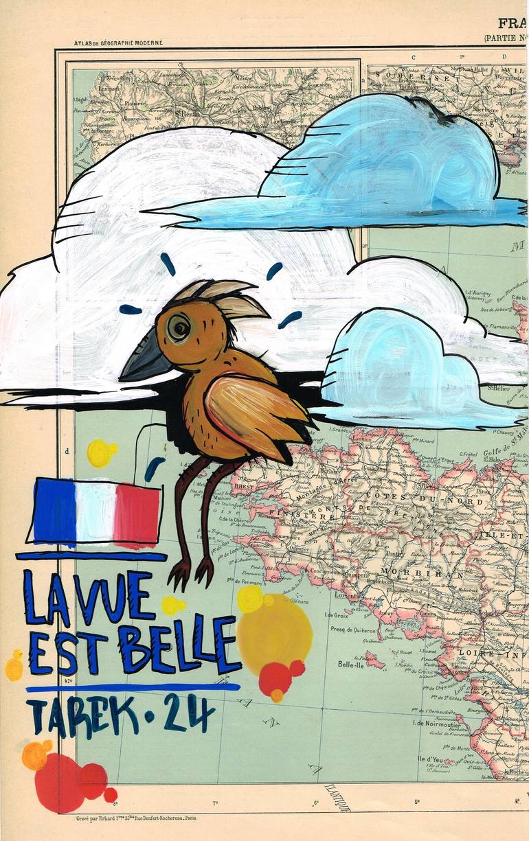 Poscas on an old map dating from 1898. This captivating artwork fuses an old map from 1898 with an assertive street art style, creating a striking contrast that draws the eye. Against the background of a map of France, a stylized bird in bright hues soars among hand-sketched clouds. The bold colors,...