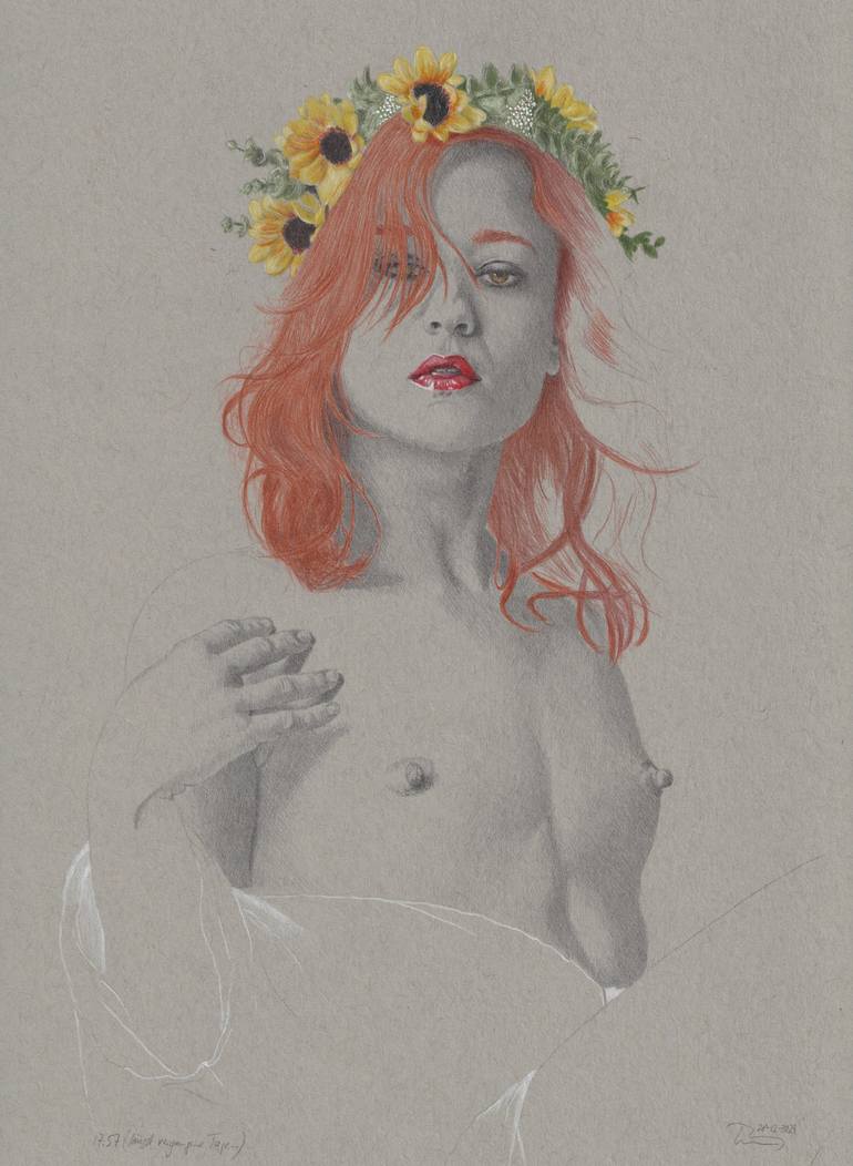 When I hear the title "days long gone" I think of the flower power or hippie movement. With the wreath of flowers in her red hair and her youth, she could have sprung from my memory. Drawing is on grey toned Strathmore cardboard