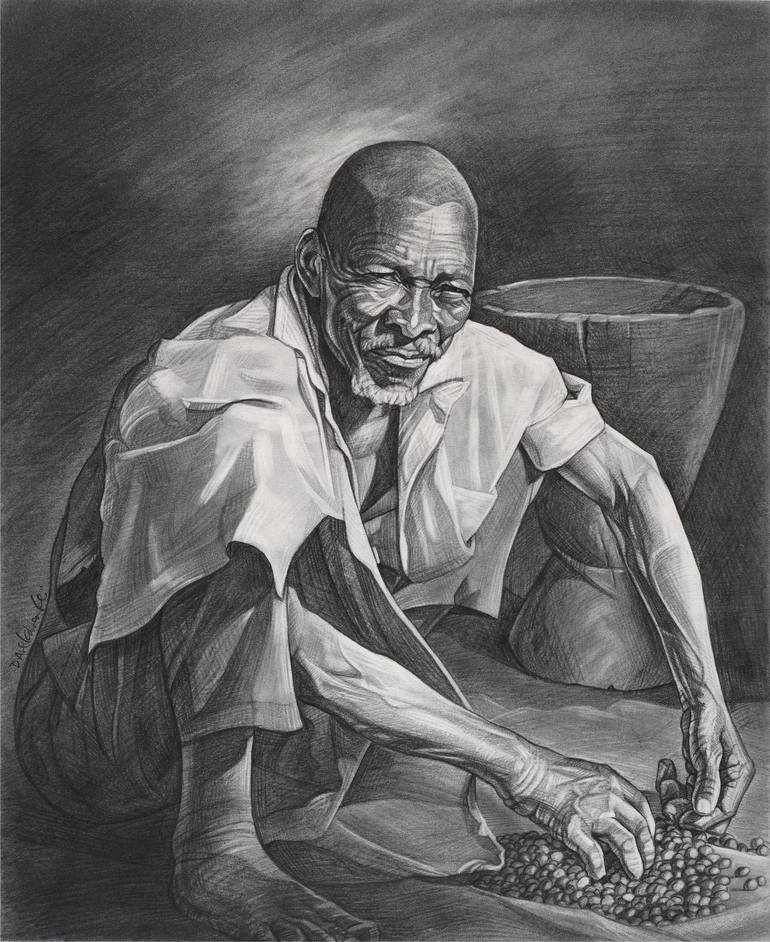 A pencil portrait drawing of an elderly African man on his farm in a rural West African village. In the villages in Guinea, much of daily life revolves around tasks related to subsistence farming. Rice, manioc, sweet potatoes, yams, and many other dietary staples are grown in the village. The work ...