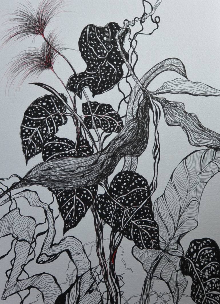 This is an imagination work, about the force of nature. I use only one size black gel pen to draw on the good quality paper. I draw the leaves with the lines and shapes to express the conflict between the complicate and simple life.
