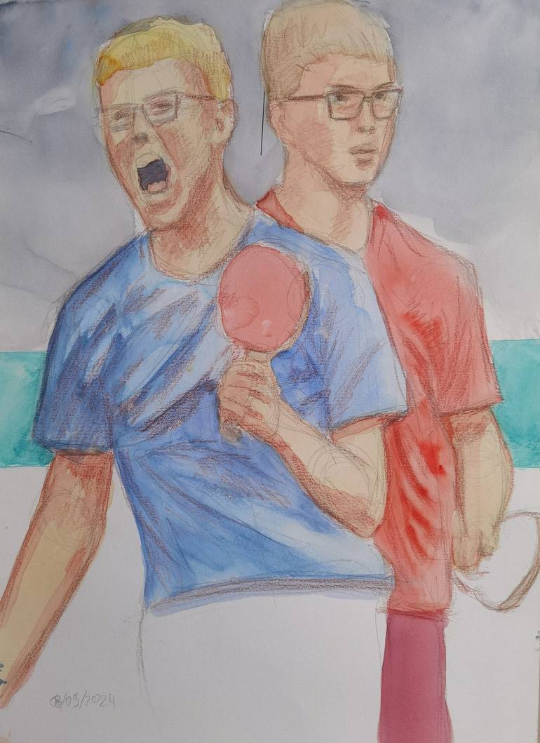 Title: The Glasses Brothers Format: Metric: 59.4 x 42 cm Imperial: 23.4 x 16.5 inches Medium: Watercolor, sanguine on paper Description: "Les Frères Lunettes (The Glasses Brothers)" captures the raw intensity and emotion of competition through the world of table tennis. The painting...