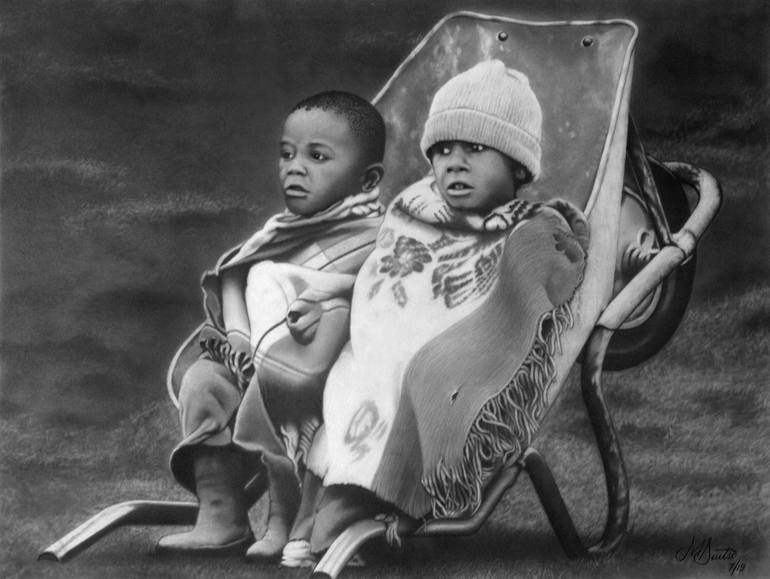 This magnificent piece will allow the viewer to soak into the feeling of warmth shown by these beautiful BaSotho boys,who also seem to have their attention drawn by a certain exercise. It could be that an older person is fetching water or firewood while they wait in the wheelbarrow. This state found...
