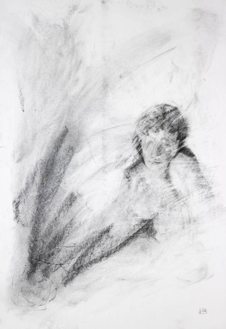 This piece is sort of mysterious with the figure's face partially detailed but leaving it to imagination. She sort of melts into the foreground with a Rembrandt type of backlighting. I like charcoal because I can be vague, spontaneous and expressive with the medium.