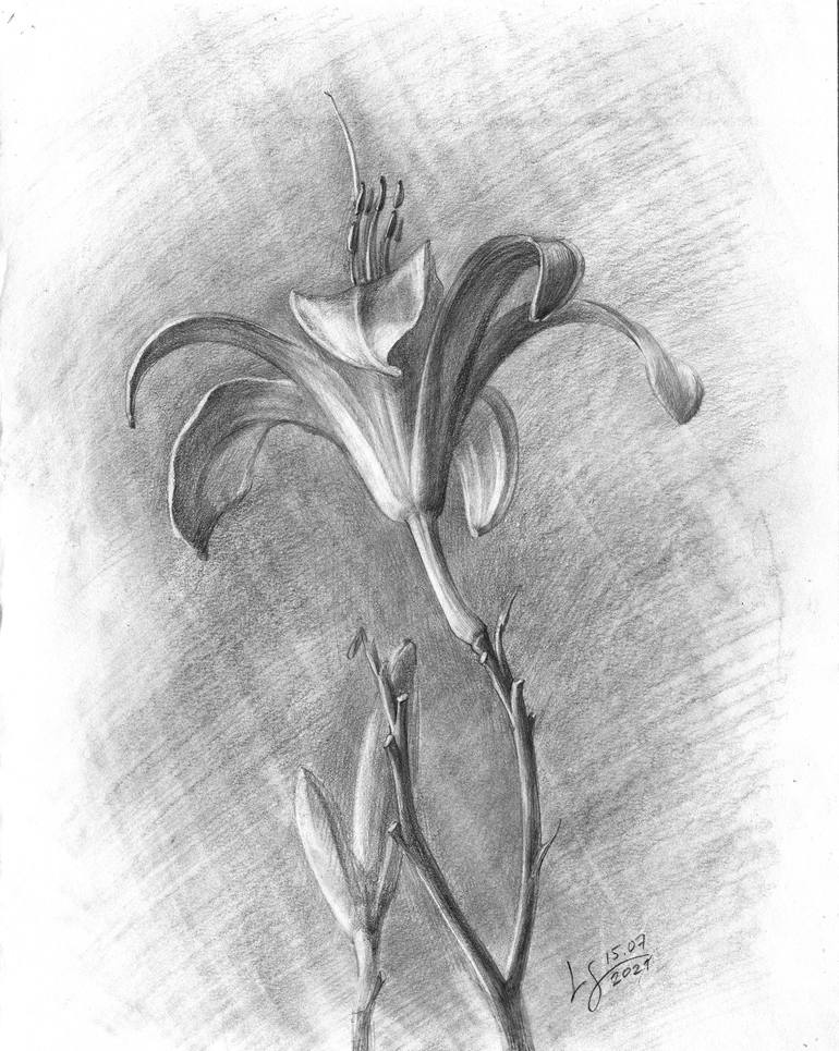 Pencil monochrome drawing of a graceful lily. I really like to draw the chiseled forms of this flower, they are very graphic and expressive. The drawing is made with a graphite pencil on professional paper 250 g/m2.