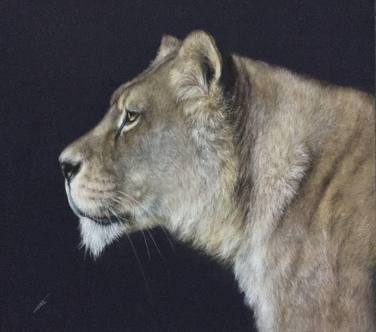 Lioness. Soft pastel drawing on Canson Velvet. This small detailed portrait took me 15 hours. I hope this sweet cat finds a place in her new home. All pastel artwork has to be framed behind glass and hung out of direct sunlight for maximum protection. Colors may vary slightly on screen according to...