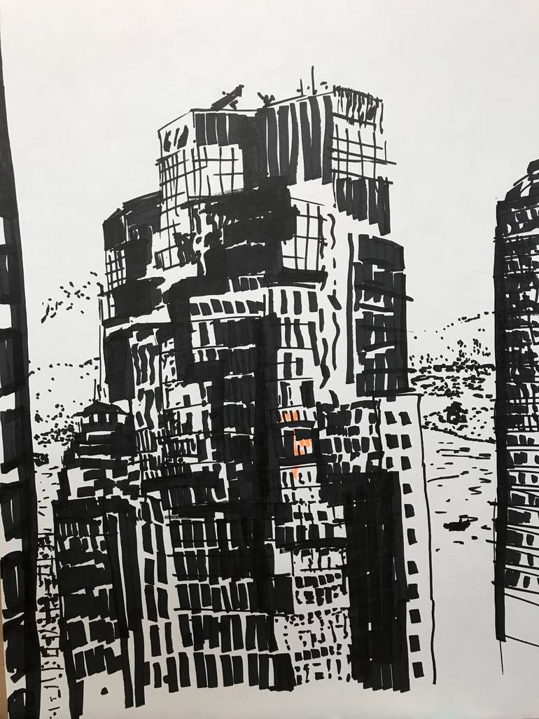 Drawn while living there. Wanted to capture the raw energy of the new skyscrapers and sought to do so with a bold marker using only fast strokes applied once.