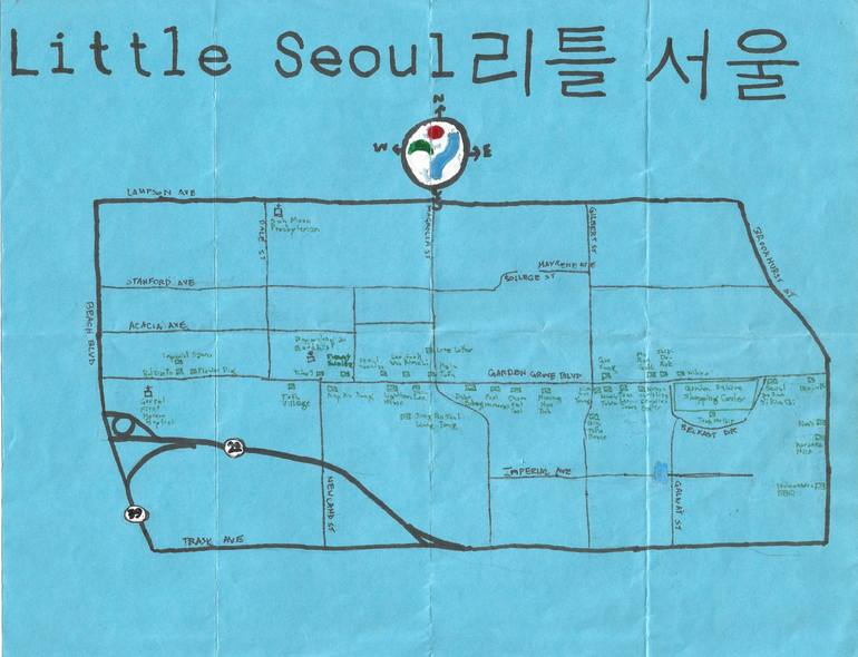 I explored Little Seoul -- officially "the Korean Business District" -- a Korean enclave in Orange County back in 2014 with Una and Colin for my series, "California Fool's Gold." I chose the blue color for the map after a popular Korean laundry soap.