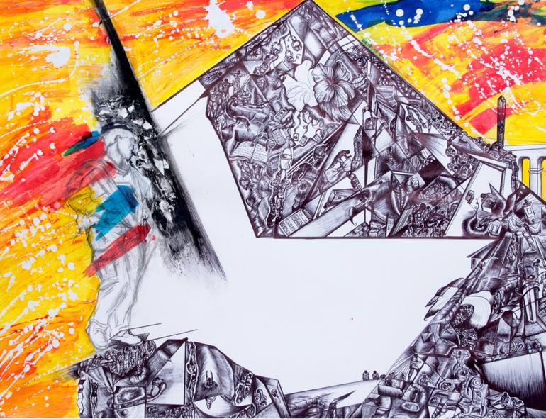 I wa inspired by thle Louvre, in Paris. The pyramid of Louvre. the man is a perpetual ovement in the society. I hope viewers identify with consumer society. Little man gravitate everywhere. I chose the colored ink for its fluidity. There is charcoal and collage on the drawing. The style of my draw...