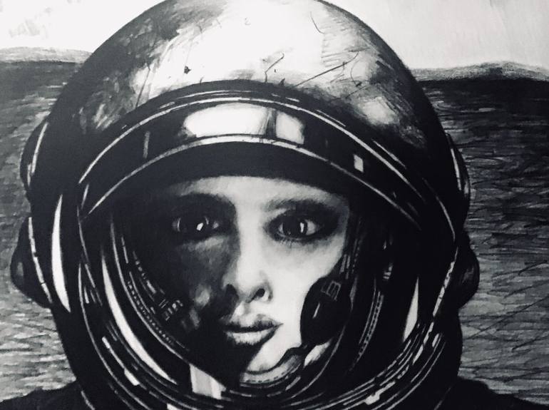 Black and white illustration on illustration board of planet mars with first girl on mars in sunset
