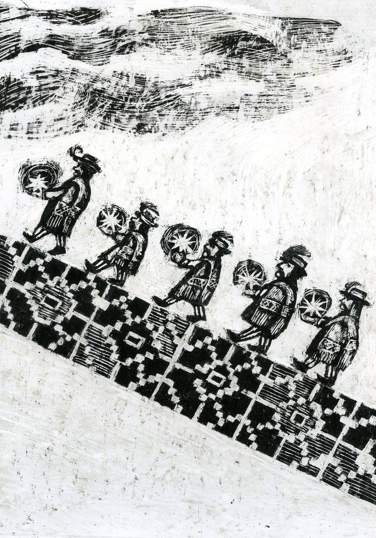 Lemko men go to heaven to God. They want to exchange the talents that God gave them for women. Talents have a symbolic image of the stars. This is an illustration to the poem by Piotr Skrijka from Krakow "History of the Lemkos" This is a scratchboard, the black ink on coated paper, coated with wax. ...