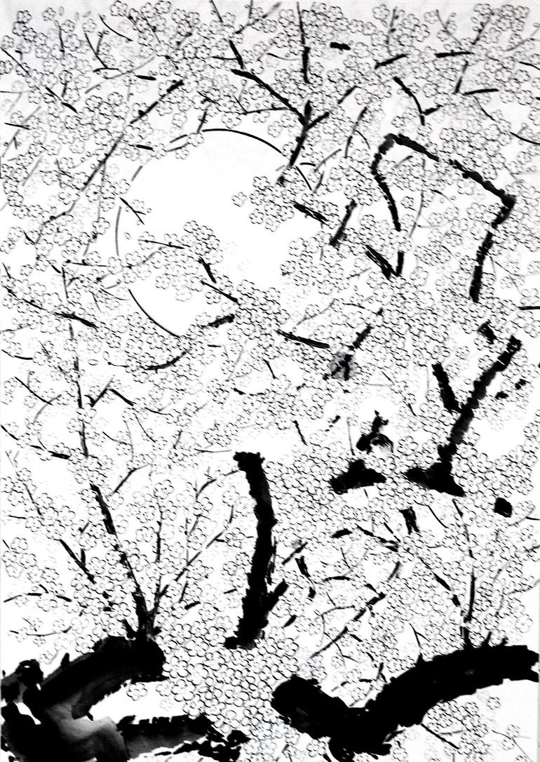 When coming closer to the tree, the flowers appear to be bigger. Viewers could see more details. The size of flowers varies to create impression size or age of trees. There are set of twelves works of each sub series in the moon light meditation. Twelves is a popular number, zodiac, religion, mont...