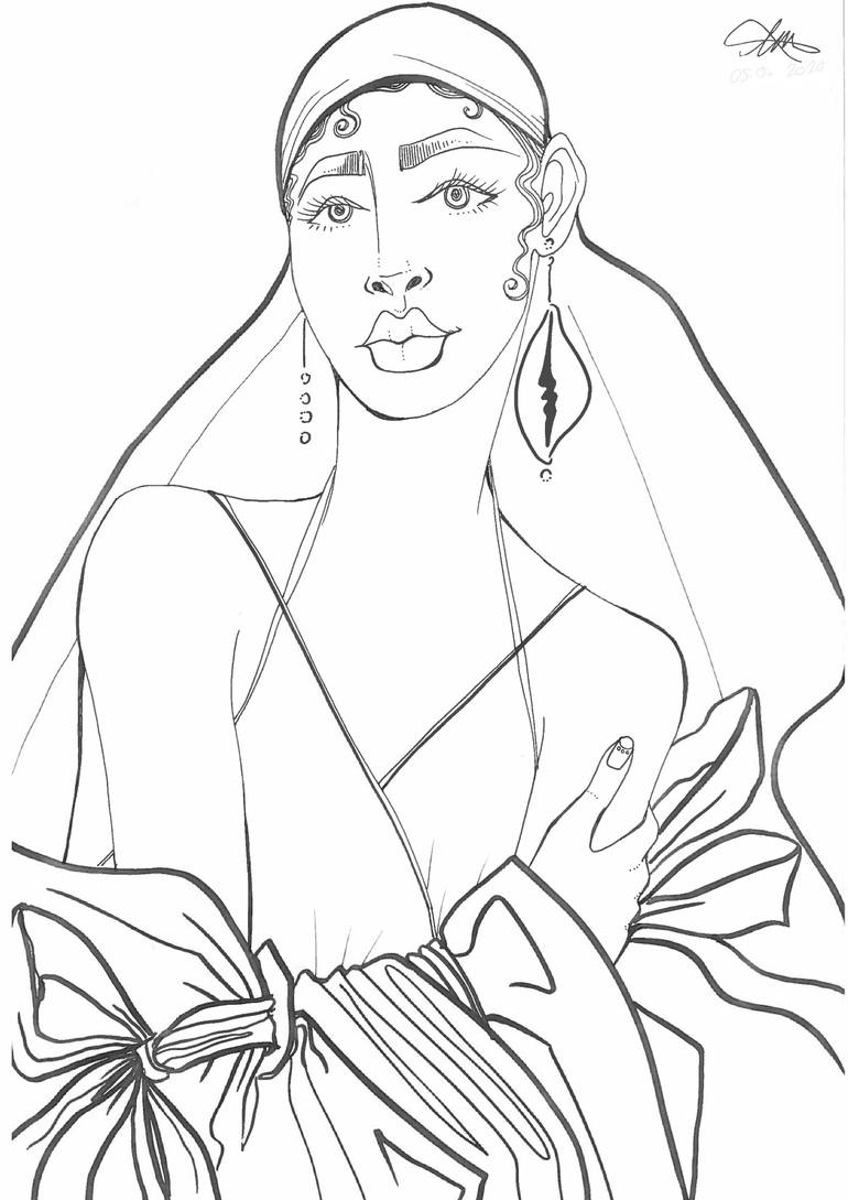 Inspired by a discovery of photographs of Somail nomad women from the 1900s and their draping of textiles over themselves, this illustration was born. This style of draping - especially to cover the head - merged with the of styling her hairline in wavy swirls (a style common with African American...