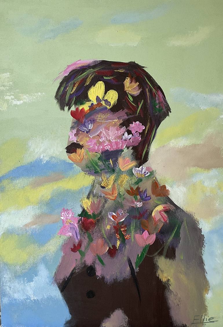 When you look at a picture, you first see the flowers and then the man. You start to think where is his face, it is mysterious. You do not see his emotions and his feelings. He hides it. Hence the name of the picture "Mysterious Man". When I painted this picture, I was inspired by people who are ver...