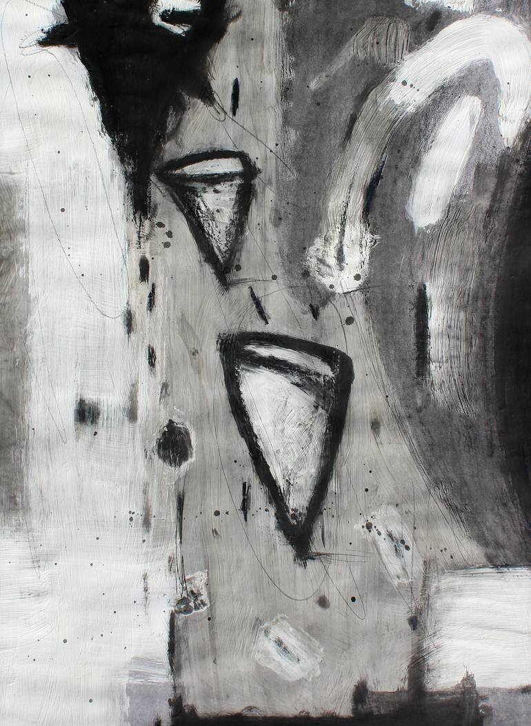 Relaxed, tired sad forms, shades of gray, blacks, whites, abstract expressive, geometric shapes, cores, funnels, cages, pseudo-spatial shapes, strong gestures, thick contours, layers on each other, energy flow and interruption