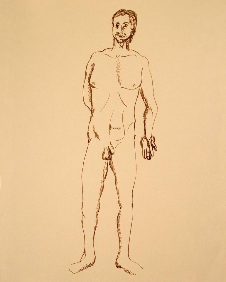NUDE EROTIC MAN WITH TOOL #011 - Ink drawing of nude men and boys on yellow ocher paper series Nude athletic boy, naked boy. Ink drawing of nude men series. Is a serie of works, studies on the male body. Men, boys and male characters to be studied in their natural environment. These are works in se...