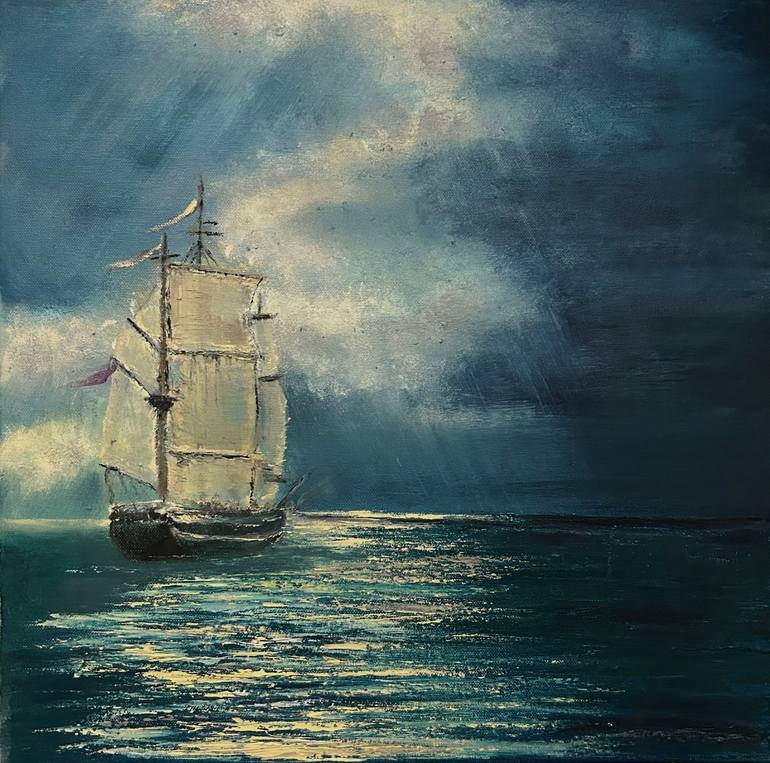 This painting portrays a lone sailing ship venturing across a vast ocean, illuminated by the silver glow of moonlight breaking through clouds. The scene is dramatic, with the dark, swirling sky blending into the tranquil yet reflective waters. The sailboat stands resilient, navigating through the di...