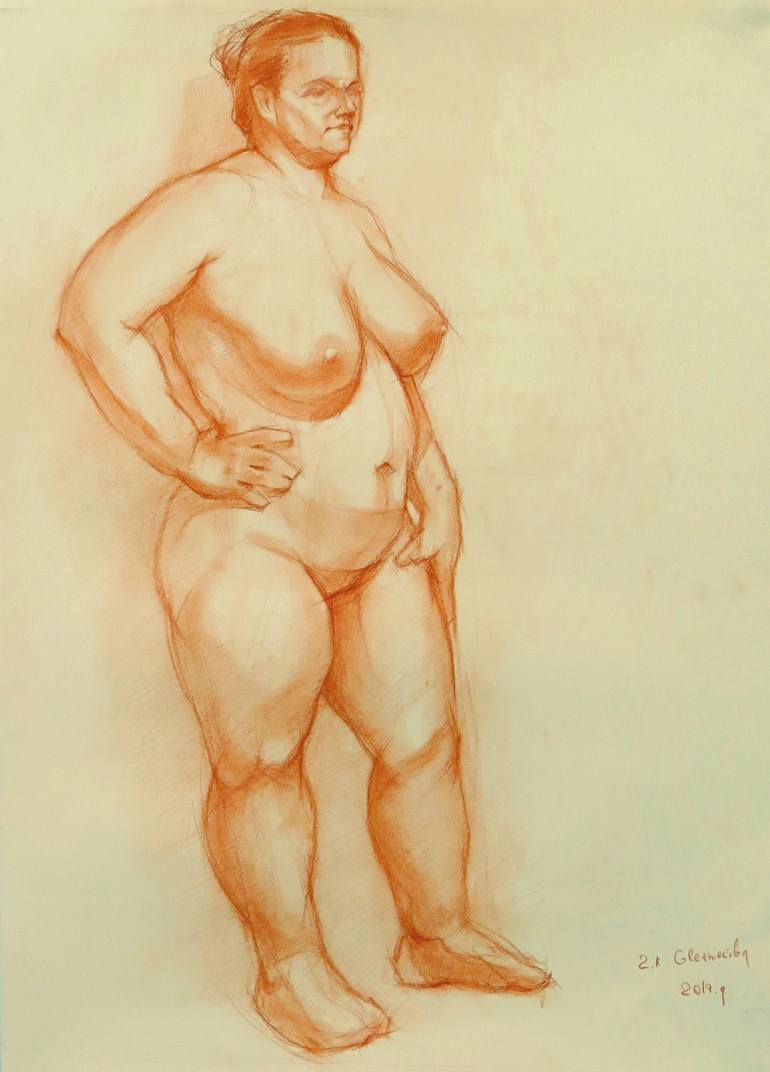 Original academic drawing - nude female figure. Red sanguine and white chalk on toned drawing paper. Made in the tradition of vintage russian realistic school.