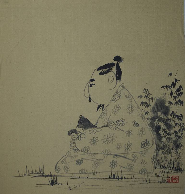 The old hermit and his cat (friend) live quietly on their mountain. They love every detail of life. Spread the ink on the yellow papyrus. The life of the old hermit looked more primitive.