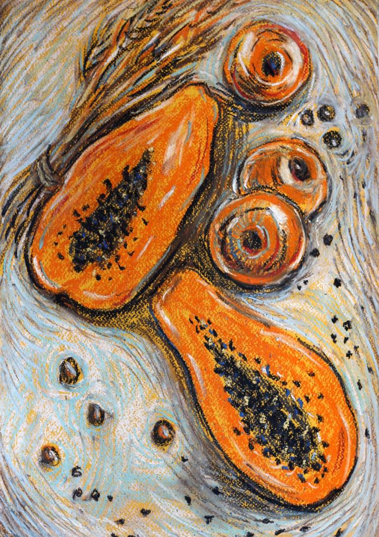 The painting depicts exotic fruits: papaya and persimmon, and on top are spikelets of wheat. The painting stimulates the appetite and gives aesthetic pleasure. My signature is on the back.