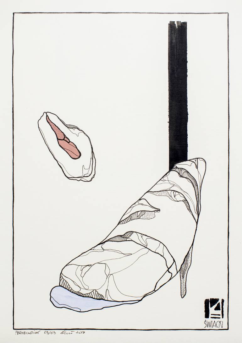 Introducing a new artwork of the "PERSECUTION". No. 03/03 Cream Paper/ écru 250 g - INK & ACRYL Every graphic made by me shows the emotions and mentality that is currently in my head. Persecution means nothing, but sexual persecution. In this series, you can see eroticism and the love of possession...