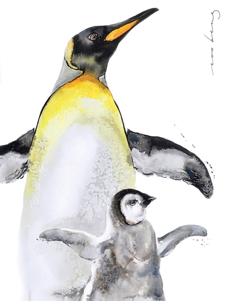 Penguin taking a trip together with her fluffy young chick. The bond of love and affection is evident between the two. Ink and watercolour on Arches 300gsm smooth cotton paper. Photo reference from Uncoated-pexels.
