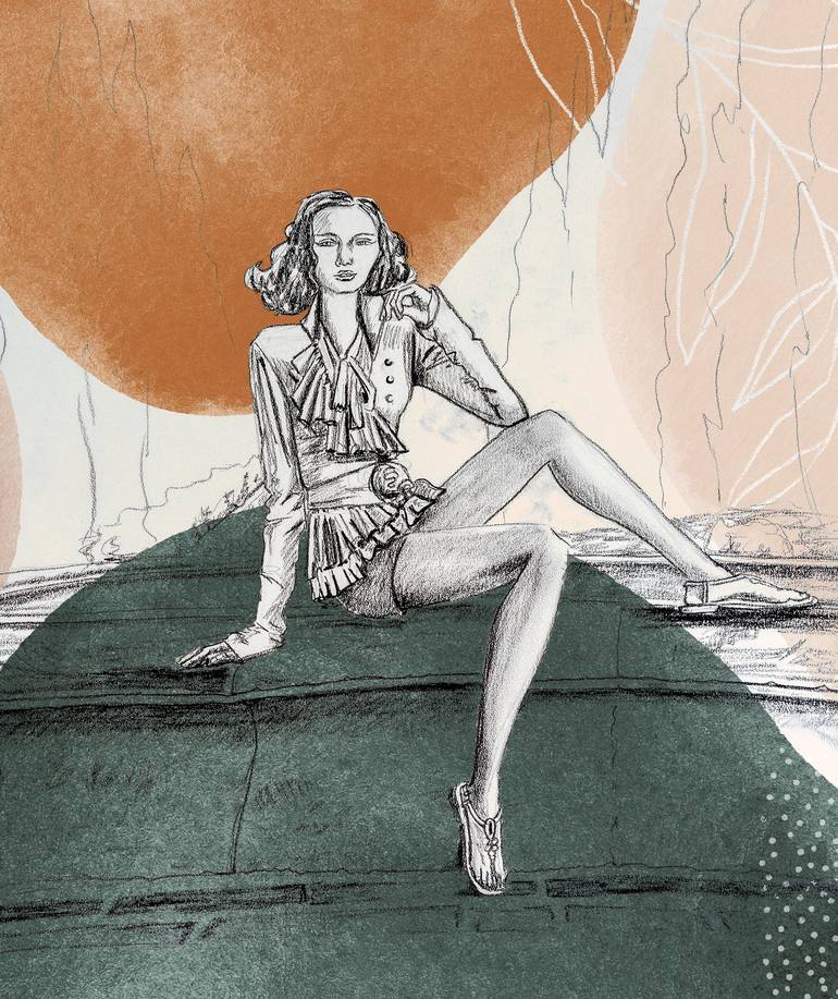 Title: Poised in Rebellion Description: There’s a subversive stillness in Poised in Rebellion. The figure sits with the elegance of vintage fashion illustration—pressed ruffles, perfectly pointed toes—but there’s a sharpness beneath the softness. Her posture is confident, unrushed, but the set of h...
