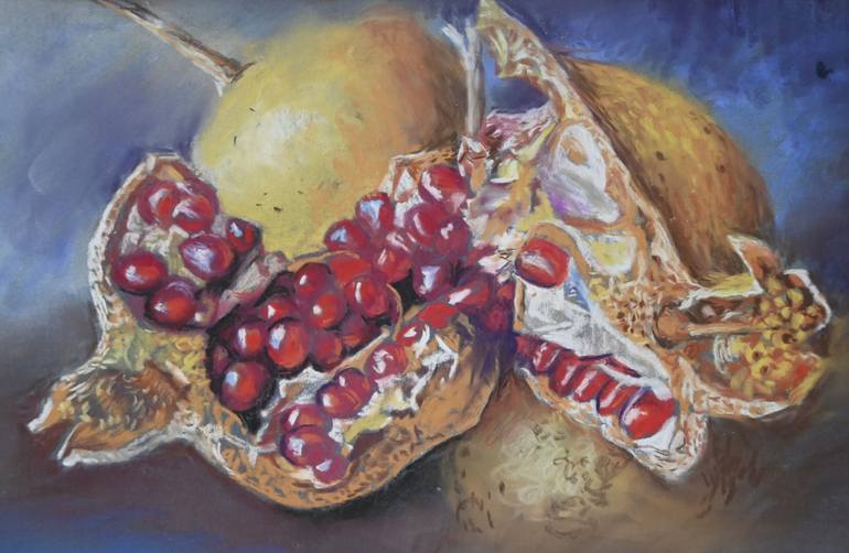 Original pastel artwork on abrasive paper. This expressive still life reveals the pomegranate as a symbol of inner power and vitality. The contrast between the warm, earthy tones of the peel and the deep ruby reds of the seeds highlights the tactile quality of pastel and the richness of color. Crea...