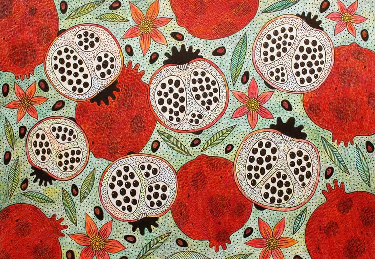 Colorful pomegranates with leaves and flowers. Colored pencils draw artwork on paper A3.