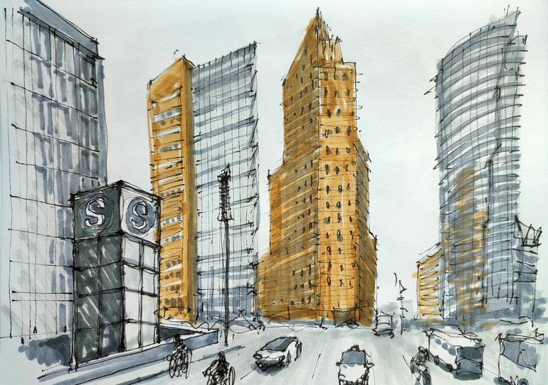 Potsdamer Platz in Berlin, Germany. Artwork is made with ink liners and markers on paper.