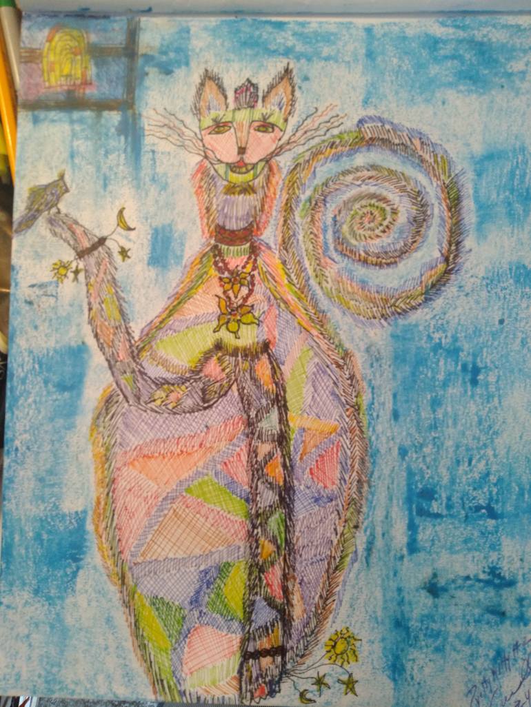 Pretty Kitty transcends instincts and is kind to little bird. If a cat can do this, imagine what we could do with conscience to create a more Peaceful World. Kitty is adorned with the universal creations of sun, moon and stars. Kitty is telling us there is much more than what we see, more to life ...
