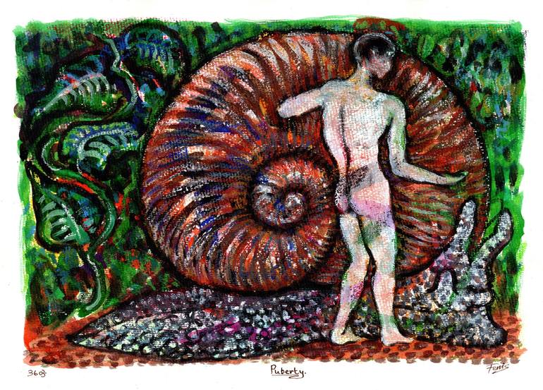 This is symbolism, as well as being extended metaphor. The age-change arrives at snail pace, but there is a primitive sliminess to it as well. I think the original image was a boy feeling a horse; I transposed it to have a very different feel.