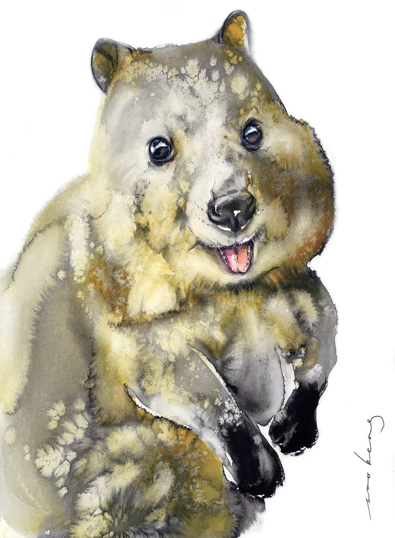The adorable quokka is affectionately known as the world's happiest animal. Its fluffy brown-grey fur, little round ears, cute black nose and cheeky grins imply a perpetual smile. Ink and watercolour on Arches 300gsm smooth cotton paper.