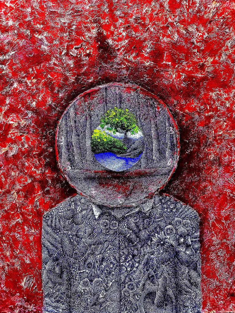 The story of my work is that the red background color represents the wounds of the forest that are increasingly being destroyed by humans. As in my work, a human figure imagines in the mind a picture of a hand carrying a tree, representing the future needing the nature of the forest and trees to liv...